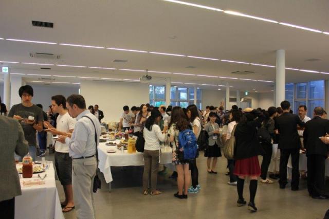 最初に濵口総長から歓迎、激励の挨拶があり、これを受け、新入留学生を代表して、国際言語文化研究科のHAY Thary(カンボジア)さんと、情報科学研究科のBRAHMASTRO Kresnaraman(インドネシア)さんが、それぞれ日本での留学についての抱負等を述べました。続いて、渡辺理事の発声による乾杯の後懇談にうつり、新入留学生が総長や教職員を囲んで、にこやかに歓談したり、記念撮影したりする姿が会場のあちらこちらで見られました。懇談会は、福田国際言語センター長の閉会の挨拶の後、大盛況のうちに終了となりました。